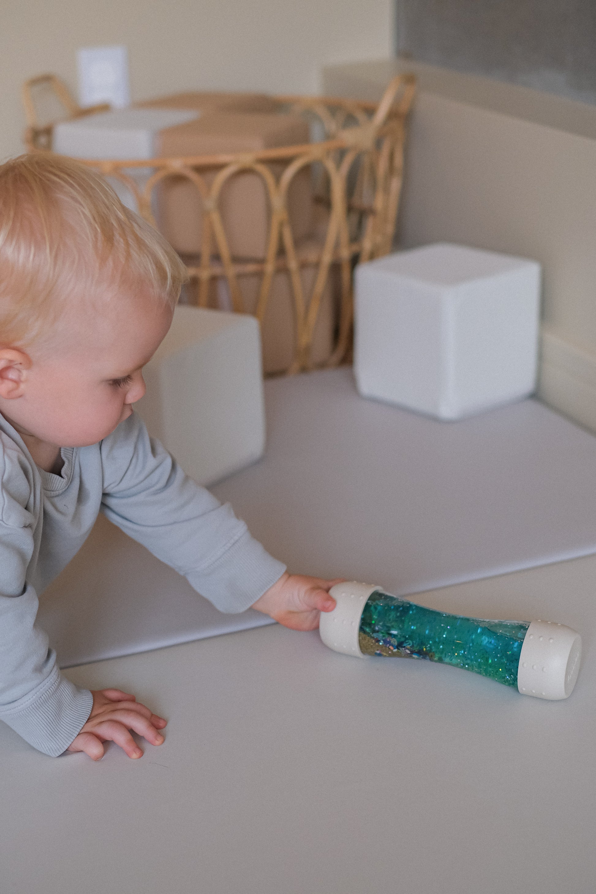 El contraste de colores, el movimiento en el agua y el suave brillo de la brillantina captan la atención visual, mientras el sonido al agitarla favorece la relajación y la concentración. Es perfecta para acompañar momentos de juego tranquilo y descubrimiento.