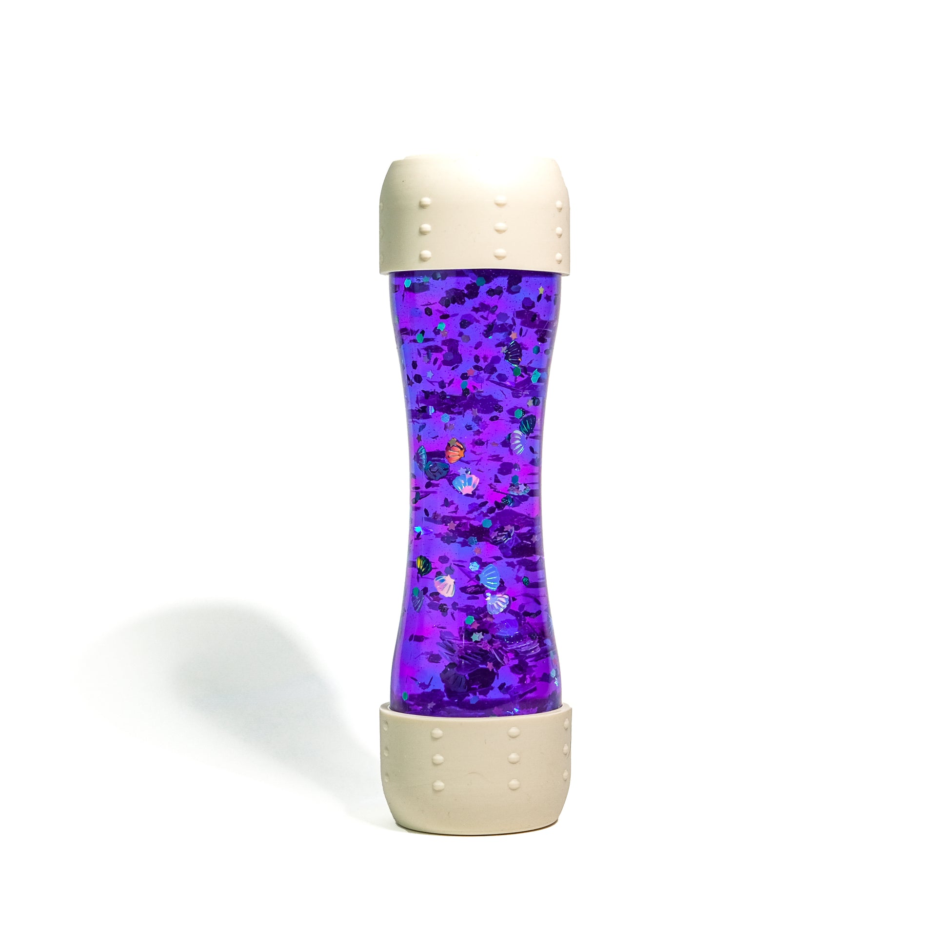 Liviana y segura para bebés desde los 3 meses, esta botella contiene agua, brillantina, cuentas en tonos aqua y violeta, y pequeñas figuras brillantes que flotan y se mueven con cada sacudida.